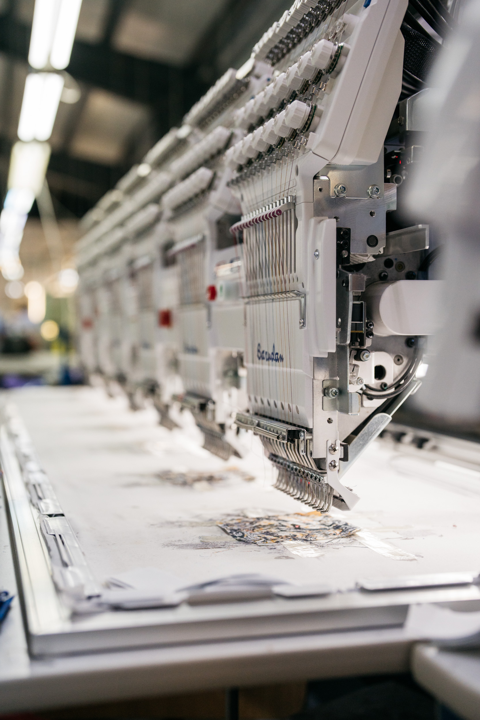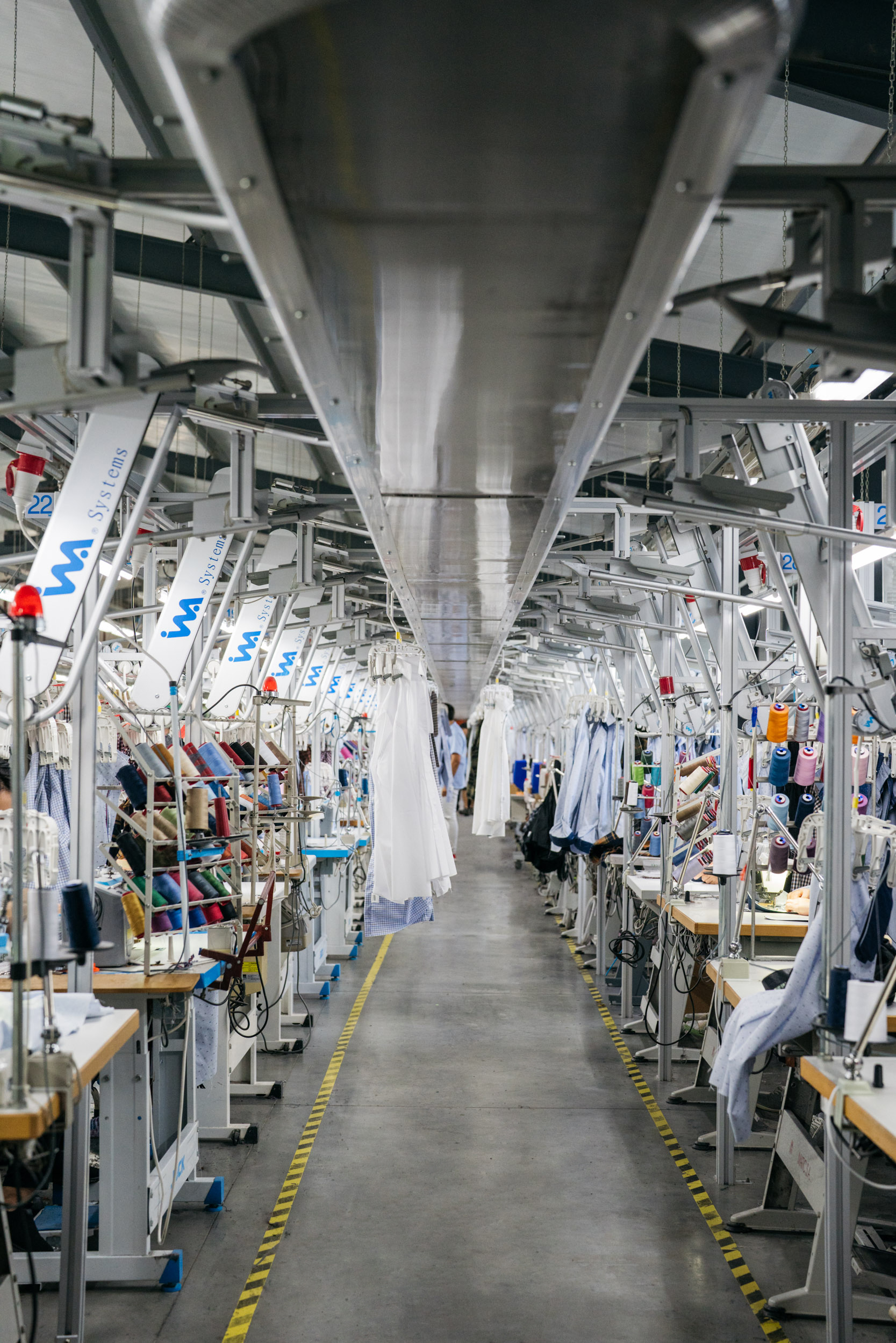 Contamos con la tecnología y los automatismos más avanzados de la industria, difíciles de ver hoy en día en Europa: corte automático, tres bordadoras de 6 cabezales, autómatas de tapetas, ojales, puños, cuellos, botones, un carrusel de distribución aérea autónomo, centro de planchado robotizado, etc.
